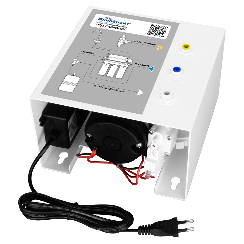 Устройство повышения давления для систем с обратным осмосом АКВАБРАЙТ УПД-ОСМО-100 стабилизирует давление воды и повышает производительность обратноосмотической системы. Для работы повышающего насоса АКВАБРАЙТ УПД-ОСМО-100 достаточно давления в 0,5 атмосфер. АКВАБРАЙТ УПД-ОСМО-100 обладает встроенным реле, которое автоматически включает устройство повышения давления если давление в системе обратного осмоса падает ниже отметки в 1,5 атм и отключает его, если давление в системе достигает отметки в 3,5 атмосфер.