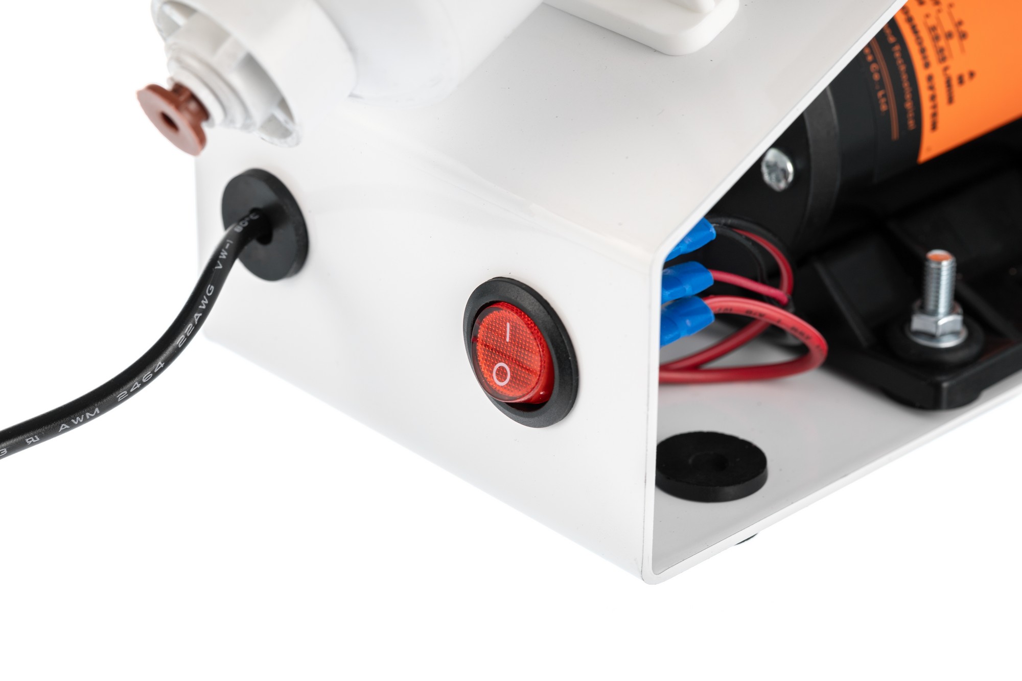 Фильтр Самогоныч состоит из картриджа, помпы, кнопки включения, блока питания, расположенных на металлической скобе.