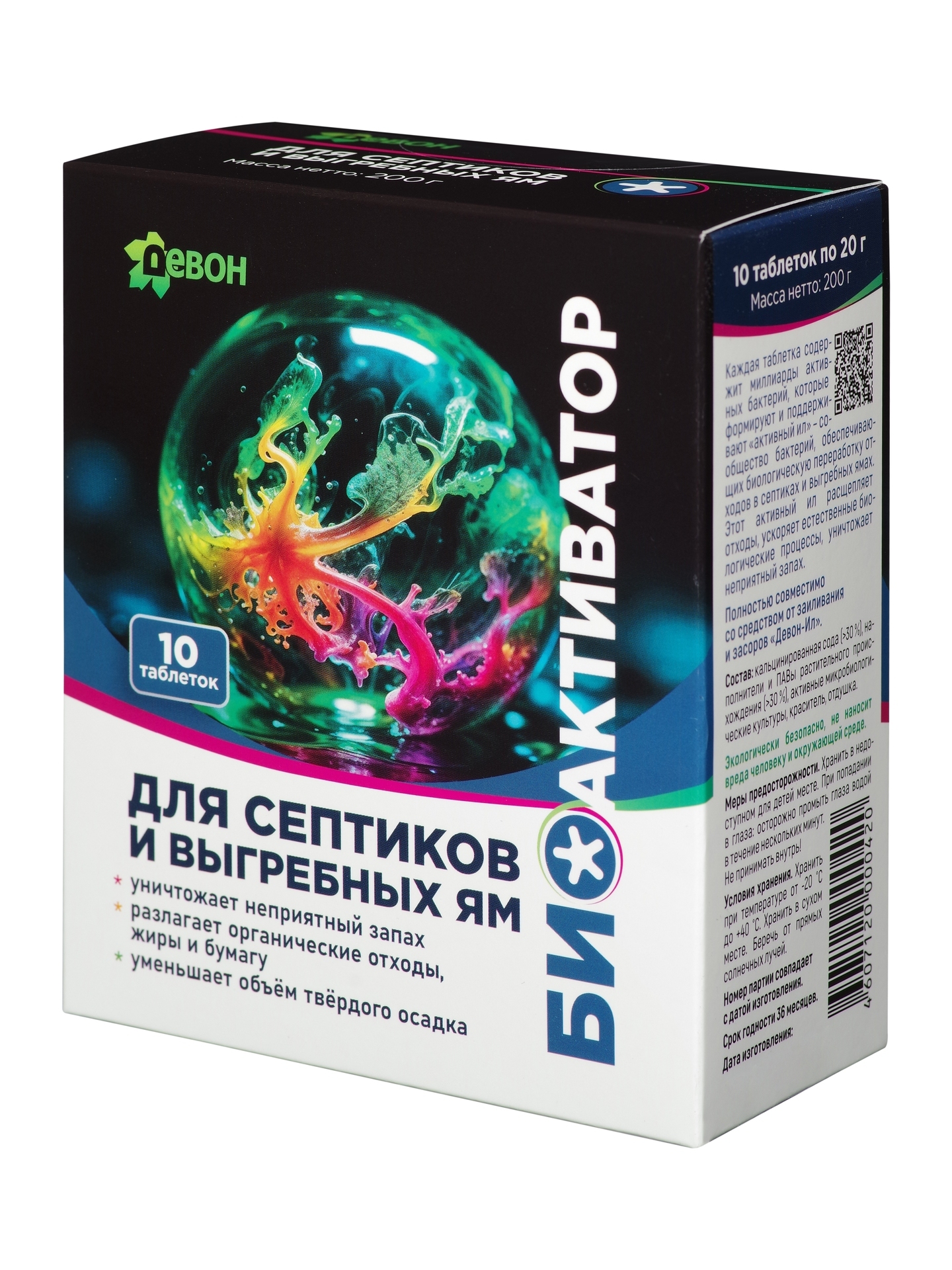 «Девон-Биоактиватор» - бактериальный препарат для септиков и выгребных ям. Каждая таблетка содержит миллиарды активных бактерий, которые формируют и поддерживают активный ил - сообщество бактерий, обеспечивающих биологическую переработку отходов в септиках и выгребных ямах. Этот активный ил расщепляет отходы, ускоряет естественные биологические процессы, уничтожает неприятный запах.