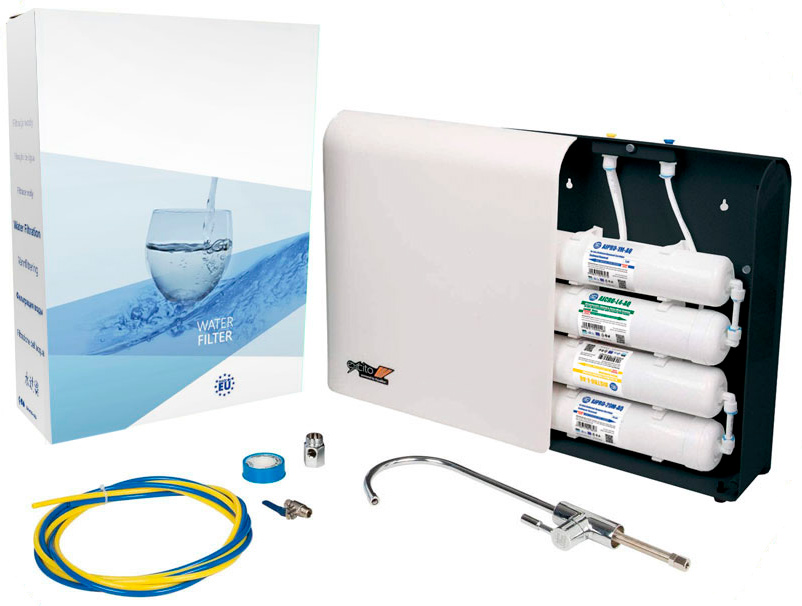 4 стадии фильтрации воды в эстетическом корпусе, с УФ мембраной. Система включает в себя AIPRO-1М-AQ и AIPRO-20M-AQ фильтры, которые удаляют отложения, такие как: песок, ил, ржавчина, веществ до 5 мкм. AISTRO-L-AQ снижает жесткость воды. AICRO-L4-AQ изготовлен из активированного уголя из скорлупы кокосового ореха удаляет хлор, пестициды, органические вещества, снижает концентрацию тяжелых металлов, а также улучшает вкус и запах воды, имеет бактериостатическое свойства.