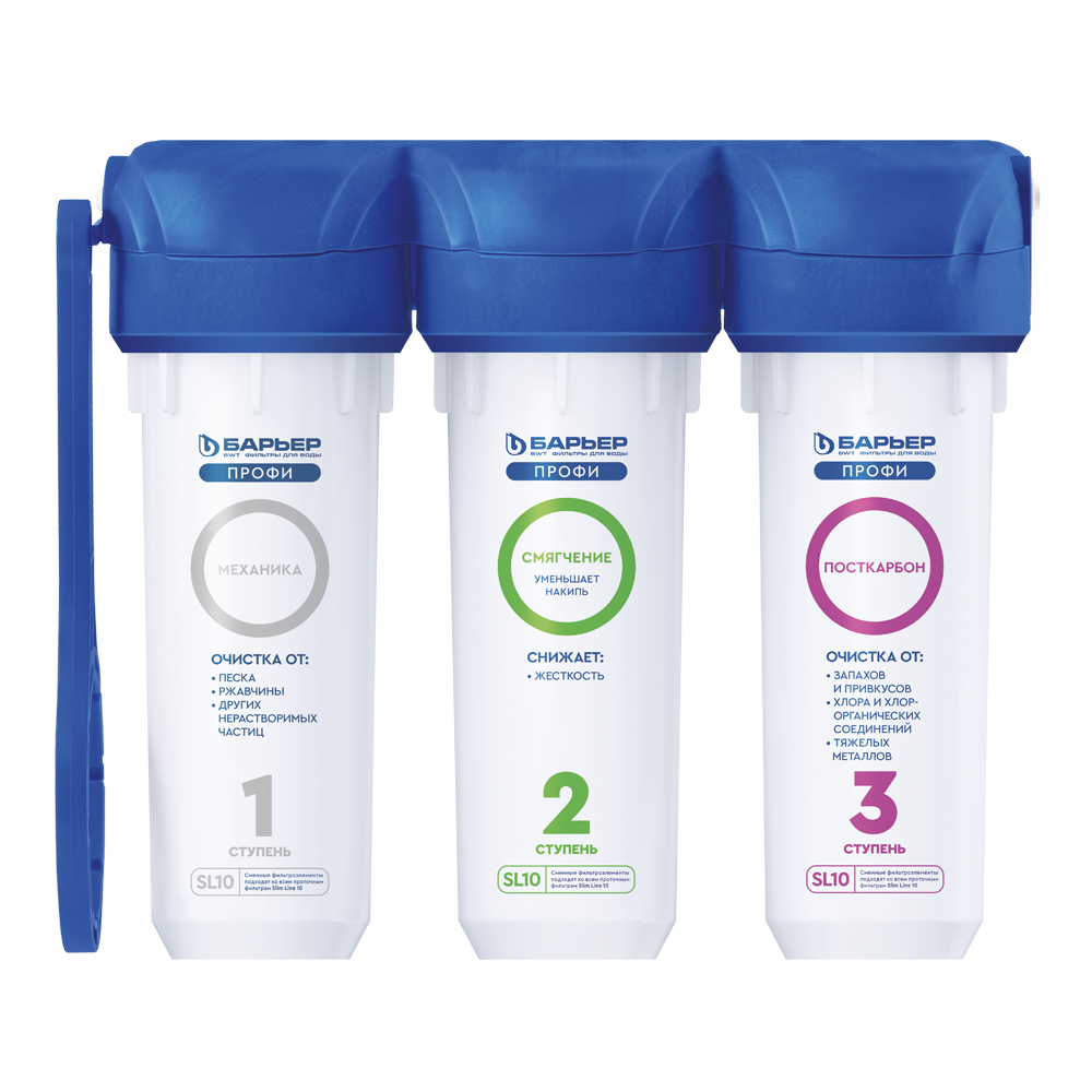 Классическая трехступенчатая система с картриджами стандарта SL 10 для очистки жесткой воды. Позволит забыть о накипи и получить вкусную безопасную воду. Производительность - 2 л/мин.