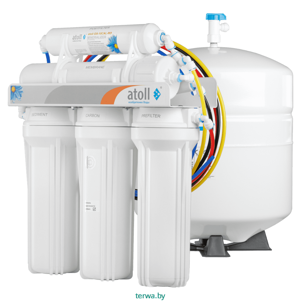 - Пятая ступень (Постфильтрация и минерализация): Минерализатор atoll GS-10CAL/RO корректирует pH воды, обогащает ее полезными минералами и улучшает вкус.