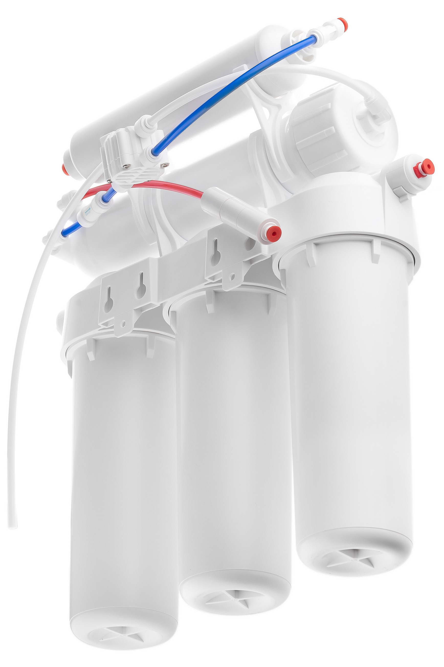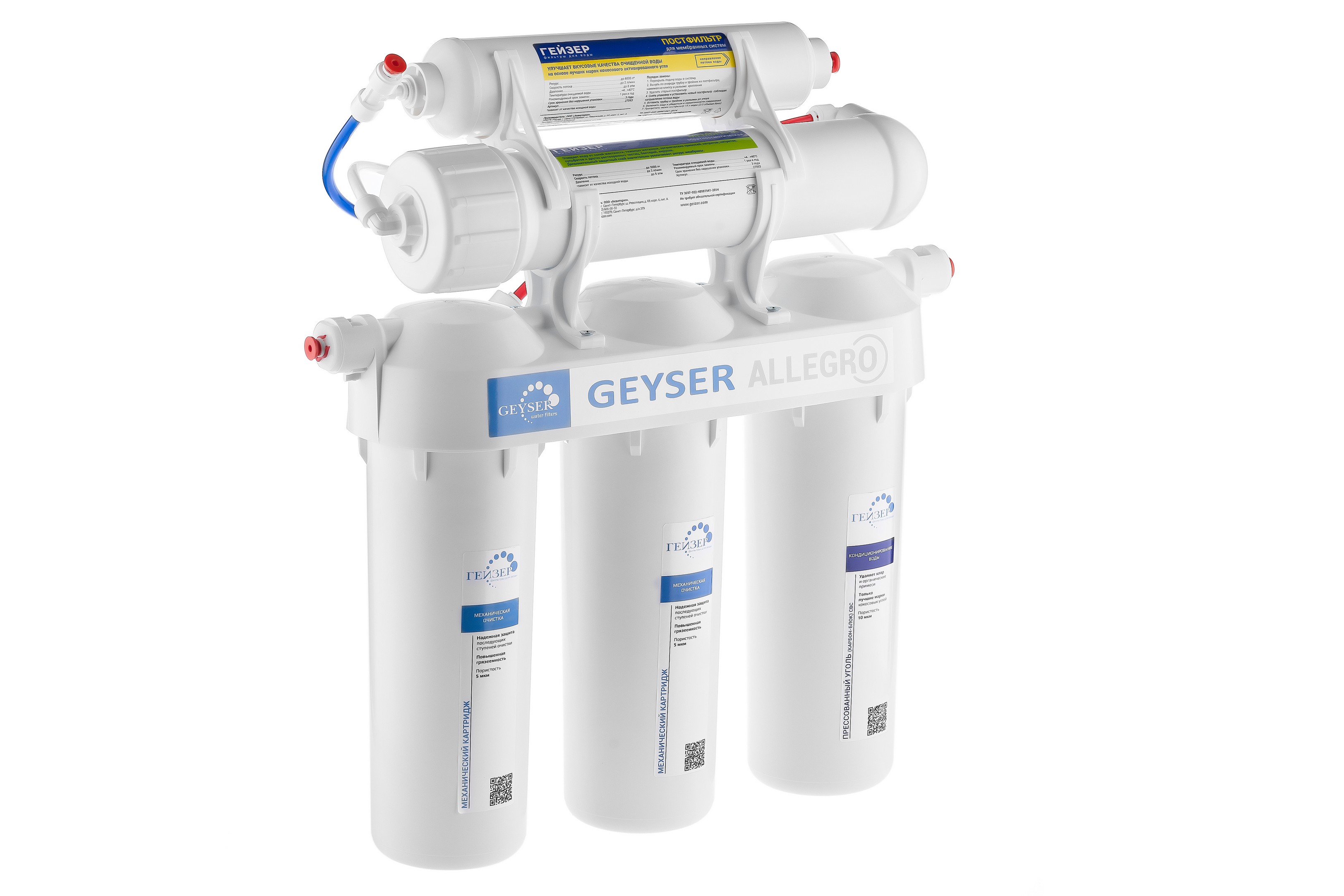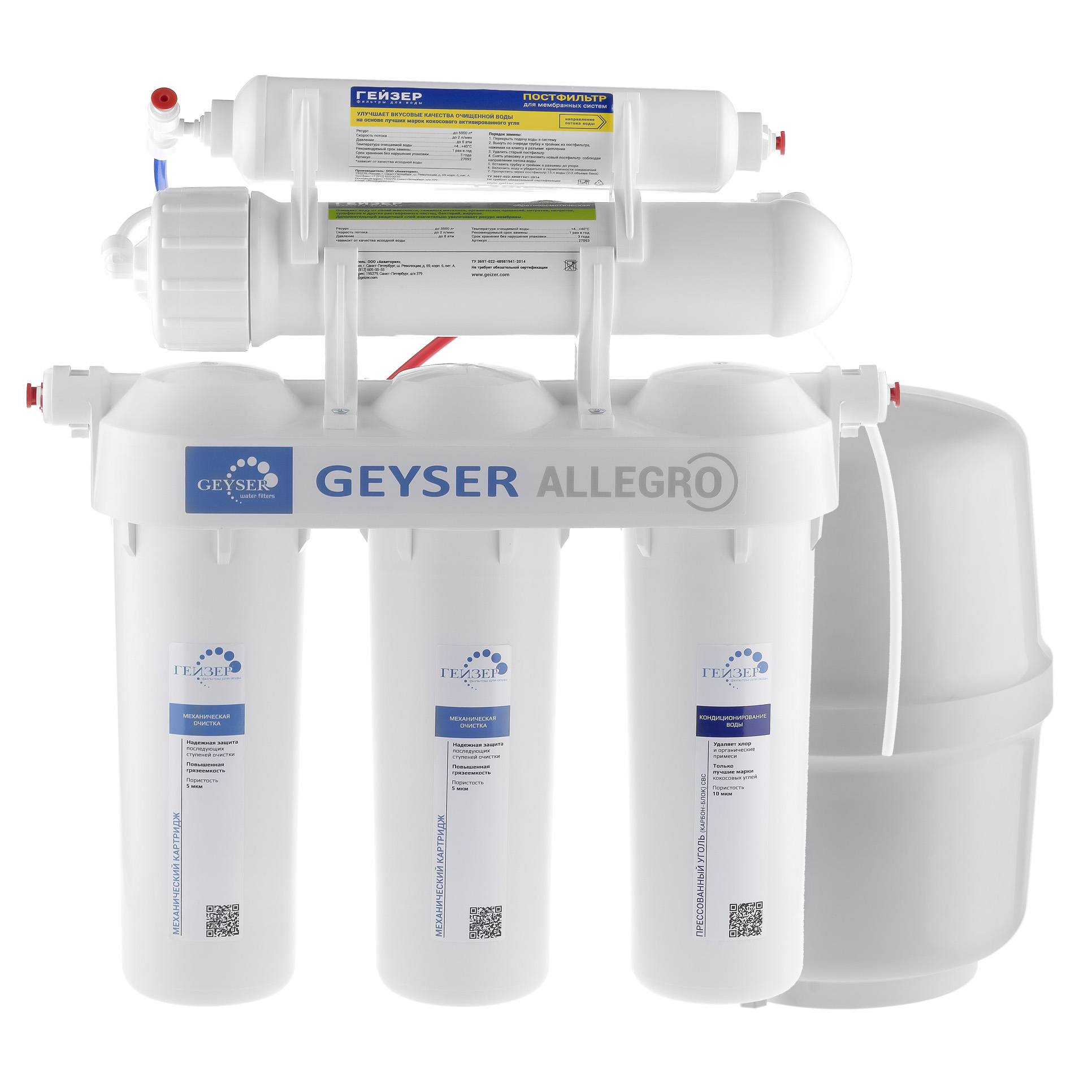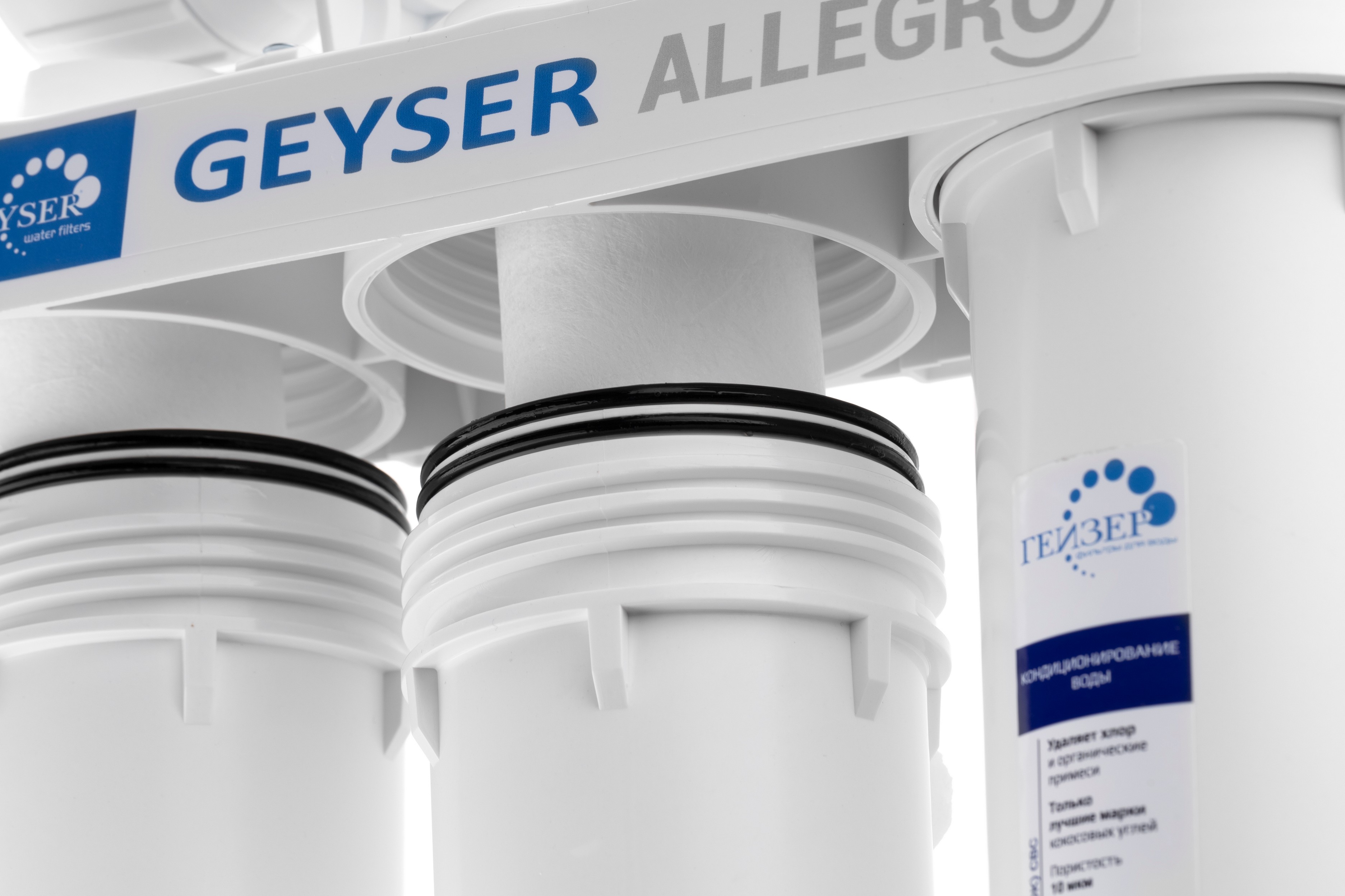 Технология обратного осмоса, использованная в фильтре Гейзер Аллегро, заключается в фильтрации воды через полупроницаемую мембрану. Размеры пор мембраны настолько малы, что пропускают только молекулы воды. Размер молекул большинства примесей, а также бактерий и вирусов значительно больше молекул воды, поэтому они не проходят через мембрану. Система работает при давлении в подводящей магистрали не менее 3 атм.