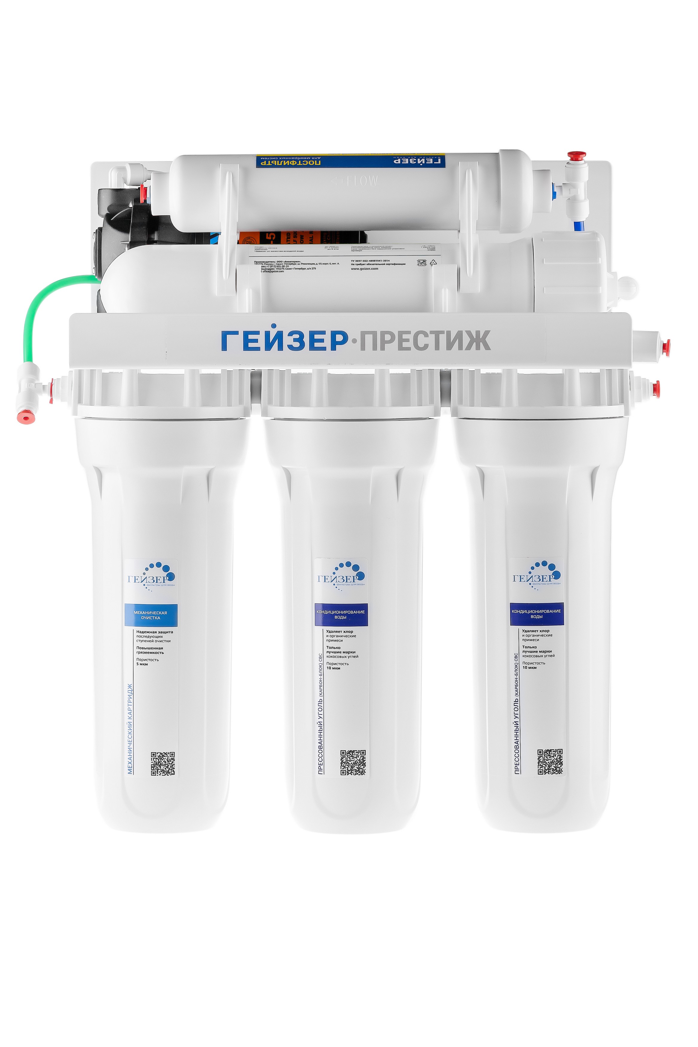 Технология обратного осмоса, использованная в фильтре Гейзер Престиж, заключается в фильтрации воды через полупроницаемую мембрану. Размеры пор мембраны настолько малы, что пропускают только молекулы воды. Размер молекул большинства примесей, а также бактерий и вирусов значительно больше молекул воды, поэтому они не проходят через мембрану. Фильтр Гейзер Престиж П работает при давлении в подводящей магистрали не менее 2 атм. Устройство повышения давления, входящее в комплект, повысит уровень давления до 3-6 атм.