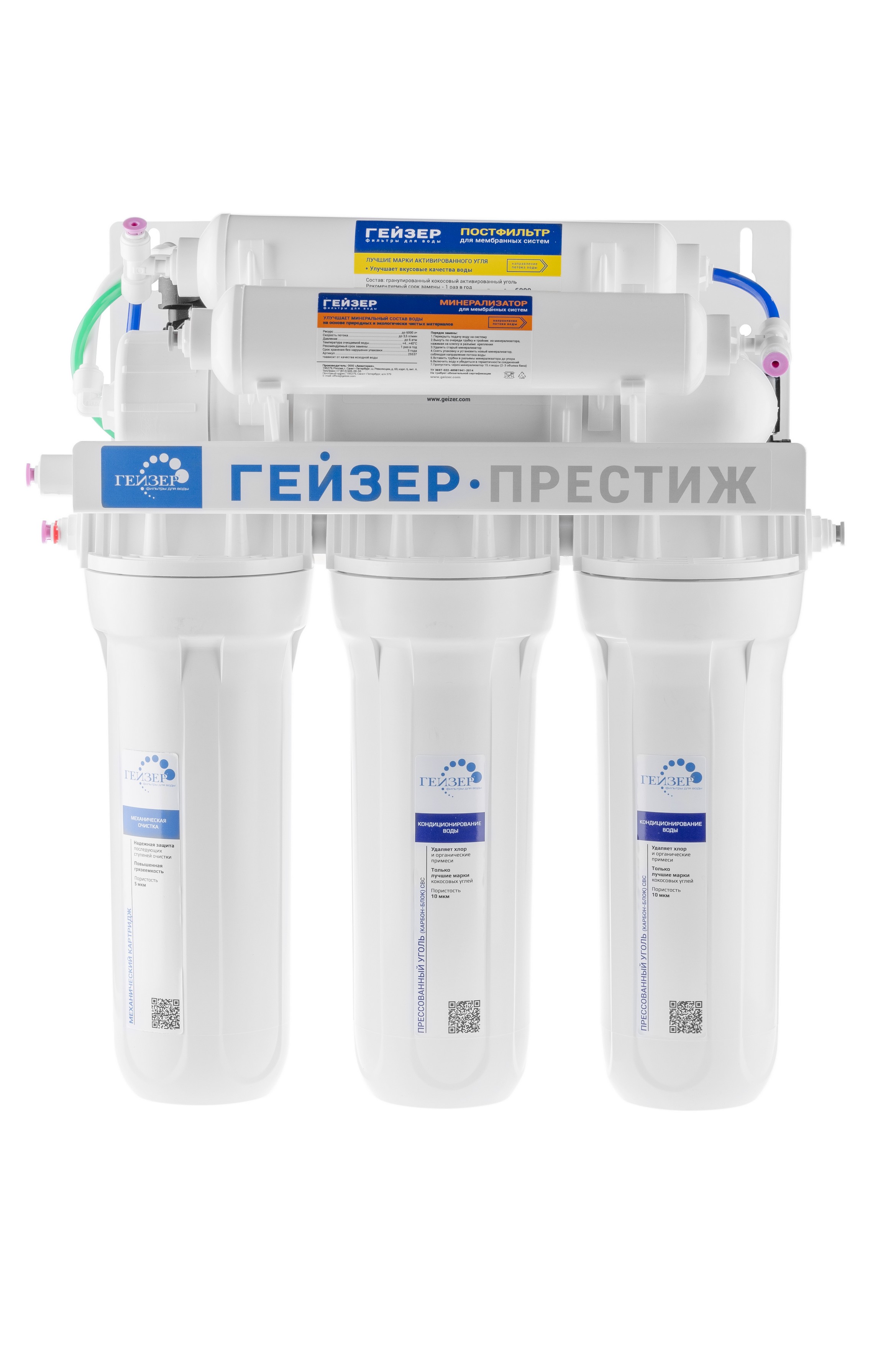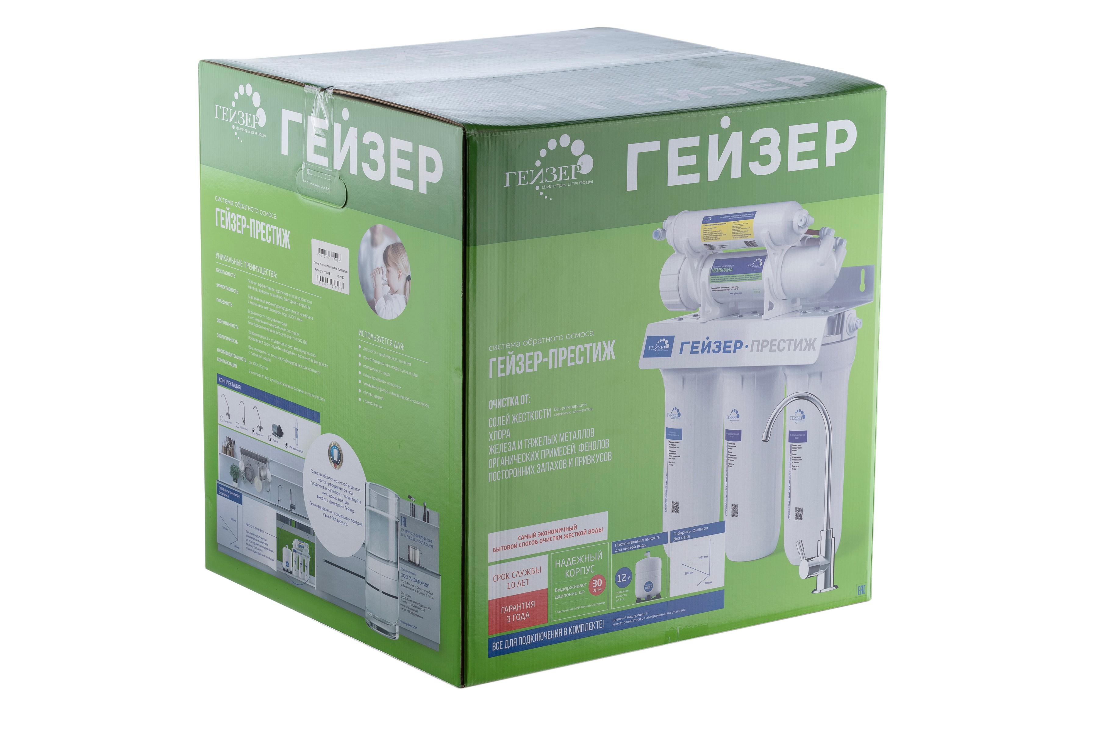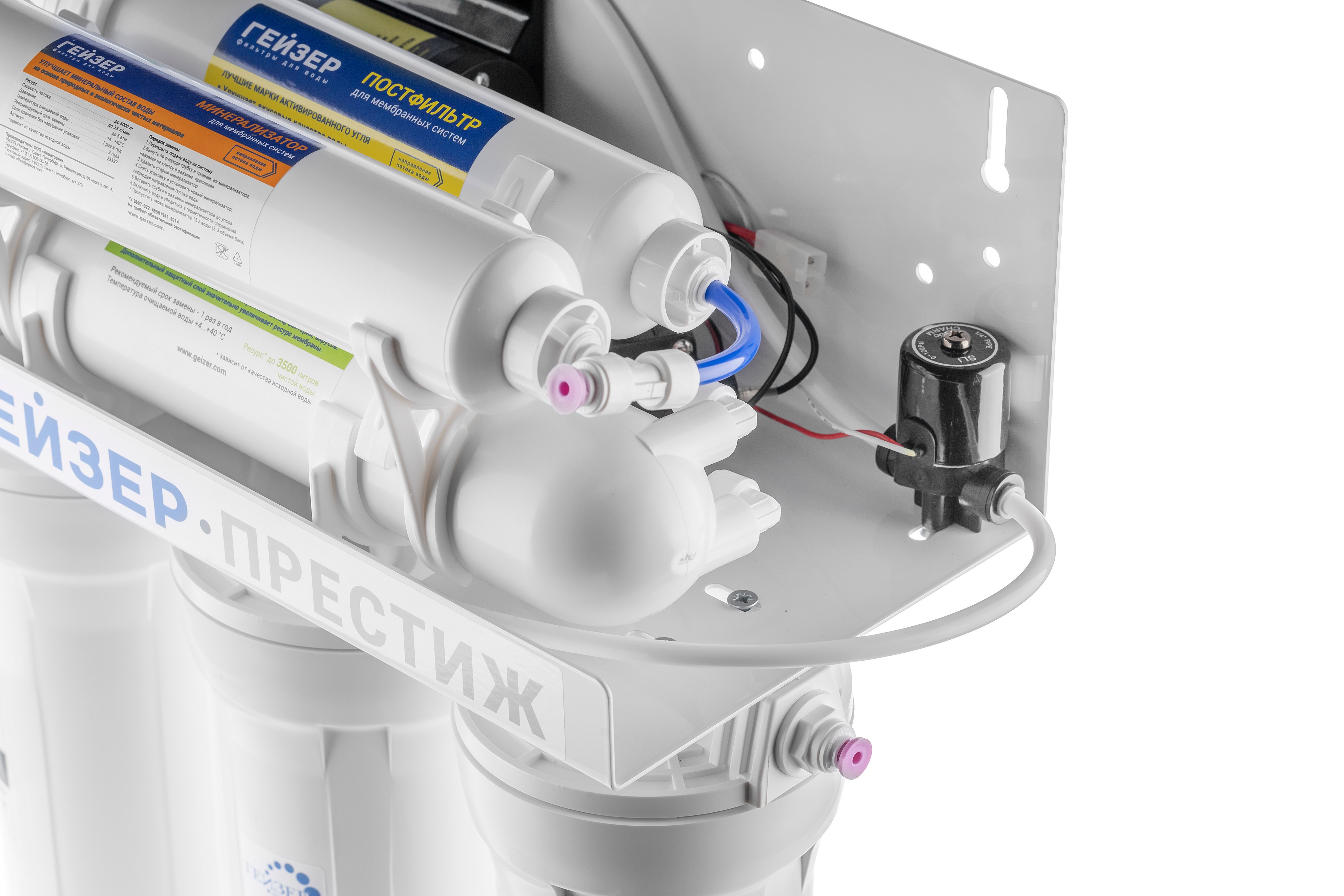 Технология обратного осмоса, использованная в фильтре Гейзер Престиж, заключается в фильтрации воды через полупроницаемую мембрану. Размеры пор мембраны настолько малы, что пропускают только молекулы воды. Размер молекул большинства примесей, а также бактерий и вирусов значительно больше молекул воды, поэтому они не проходят через мембрану. Фильтр Гейзер Престиж ПМ работает при давлении в подводящей магистрали не менее 2 атм. Устройство повышения давления, входящее в комплект, повысит уровень давления до 3-6 атм.
