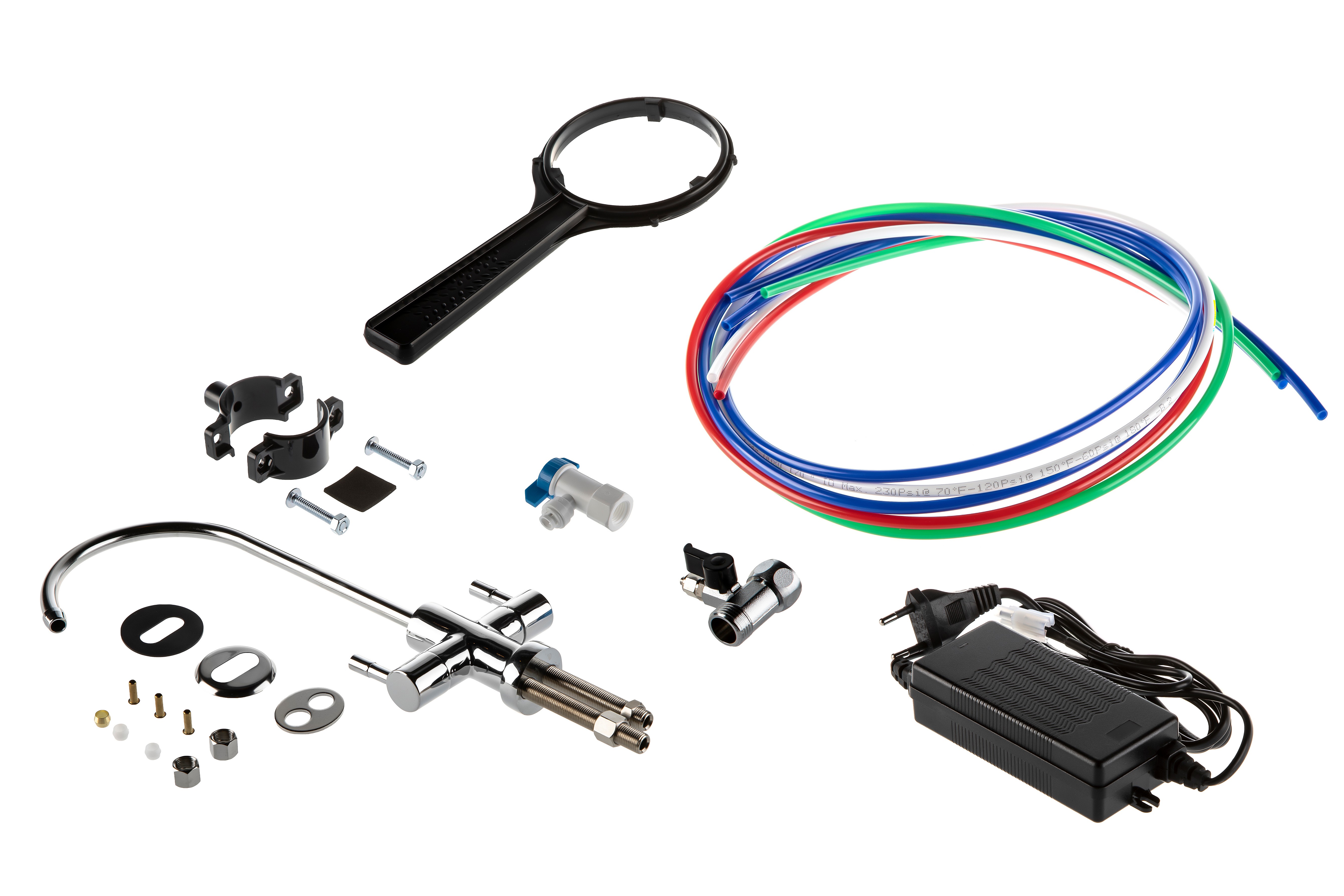 В комплект системы входит минерализатор «Баскон» для насыщения очищенной воды полезными солями кальция и магния до оптимального уровня жесткости воды — 1–1,5 мг–экв/л. Особый двухклавишный кран позволяет выбрать минерализованную или осмотическую воду(если вы хотите выпить стакан воды, обогащенной полезными микроэлементами) или без них (для приготовления чая, кофе). Вкус напитков, приготовленных на абсолютно чистой воде гораздо богаче и ароматнее.