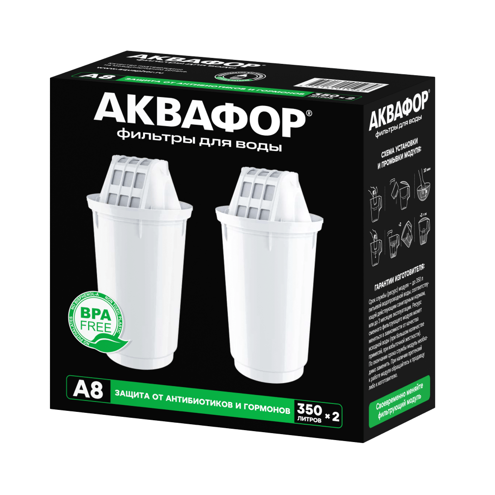 Модуль A8 не забивается раньше времени, даже если вода ржавая и мутная, он продолжает очищать воду от видимых и растворенных примесей, даже таких, как остатки медицинских препаратов, включая антибиотики и гормоны.