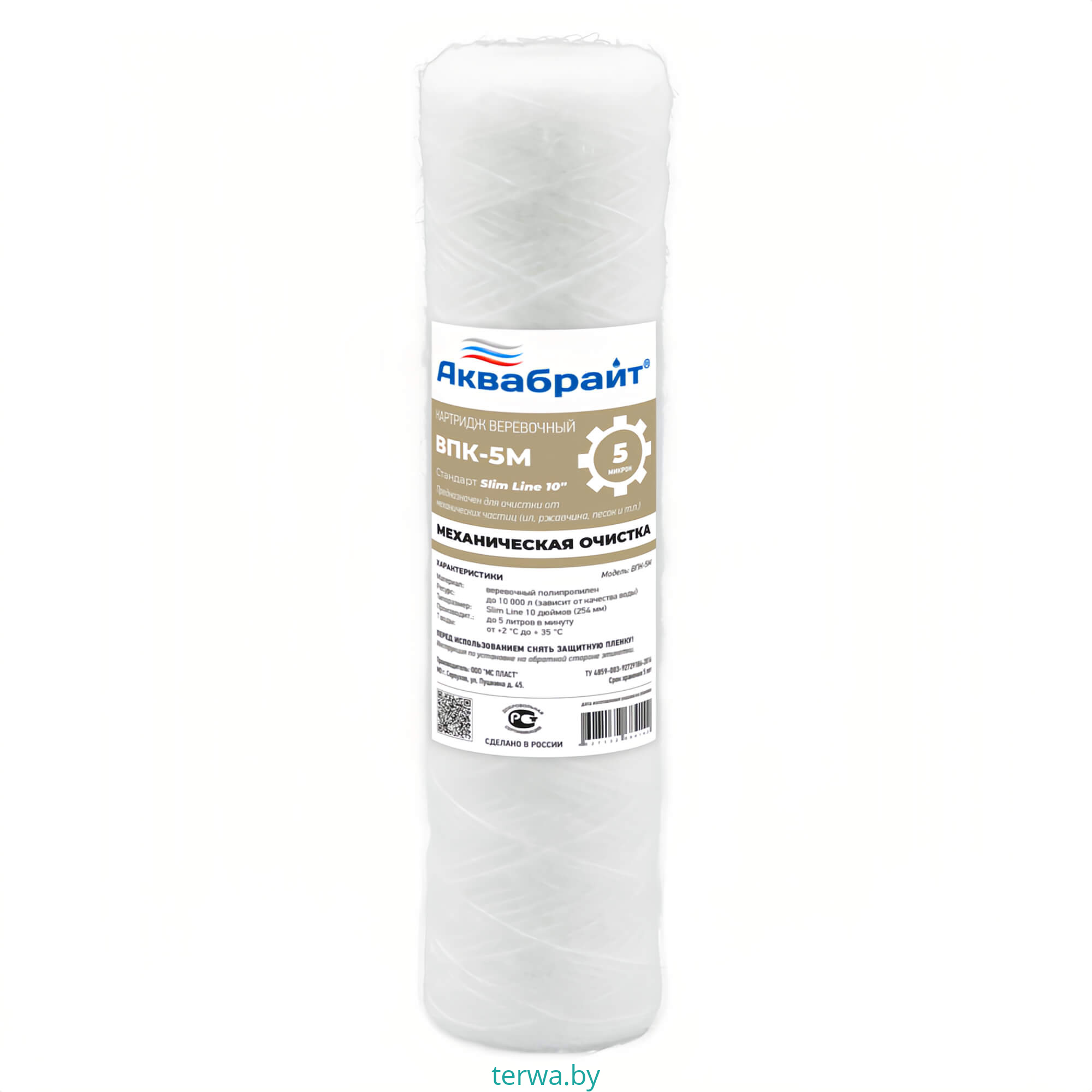 Картридж АКВАБРАЙТ ВПК-5М изготовлен из пневмотекстурированного веревочного полипропилена с пищевым допуском.