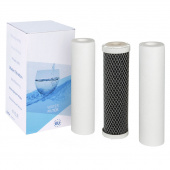 Набор из 3-х сменных картриджей для систем серии FP2 и система обратного осмоса (small servis). Набор включает в себя: FCPS5, FCPS20 (сертифицированно NSF) и FCCBL. Активированный уголь (картридж FCCBL) адсорбирует хлор, органические вещества и улучшает вкус и запах фильтрованной воды, дополнительно снижает примеси, такие как песок, ржавчина и другие примеси.