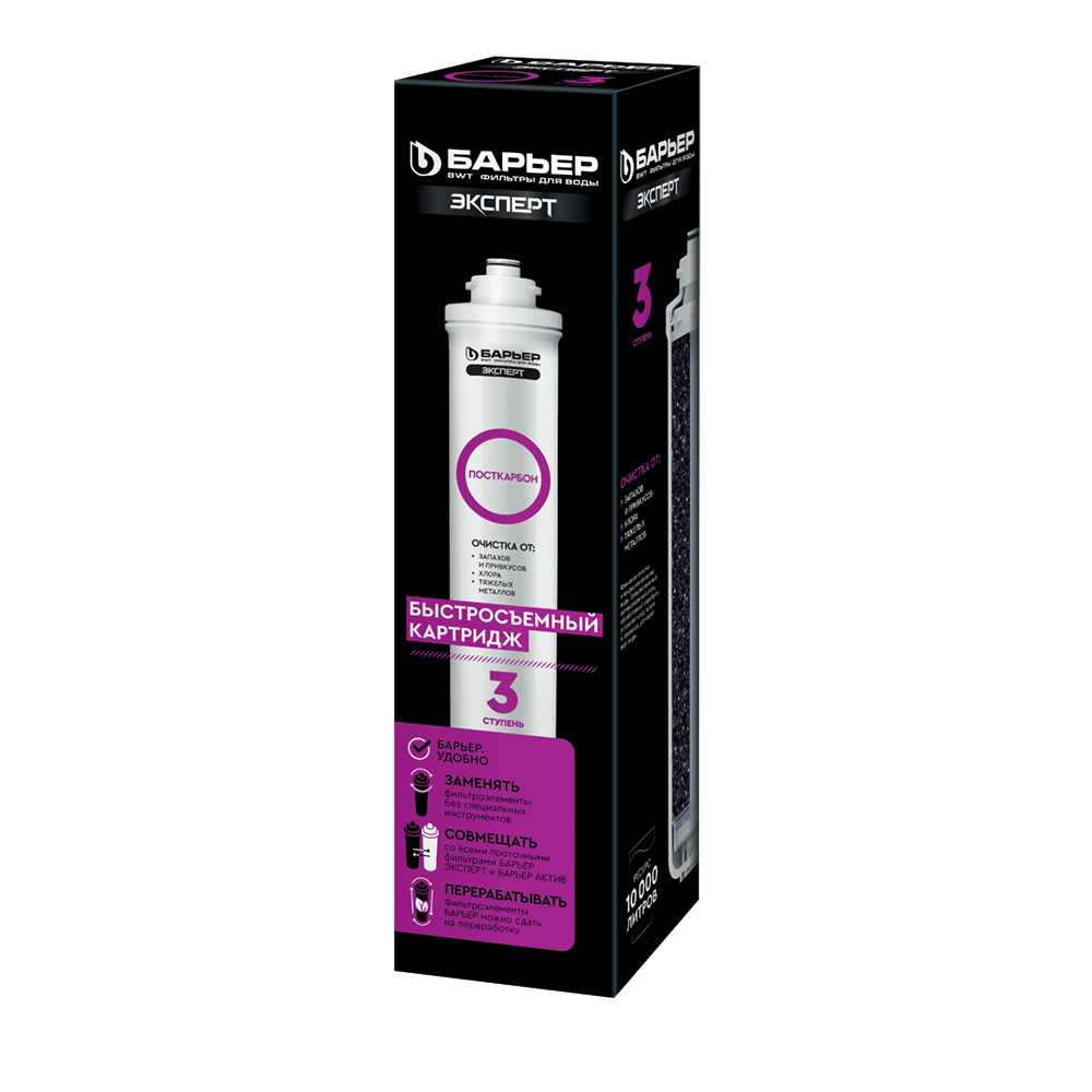 БАРЬЕР ЭКСПЕРТ Посткарбон - картридж тонкой угольной фильтрации. Устраняет неприятные привкусы, запахи, остаточный хлор. Совместим со всеми фильтрами семейства БАРЬЕР Эксперт. Используется в качестве третьей ступени. Картридж заменяется удобно, одним движением, без специальных инструментов. Технология Smart lock обеспечивает защиту от протечек.