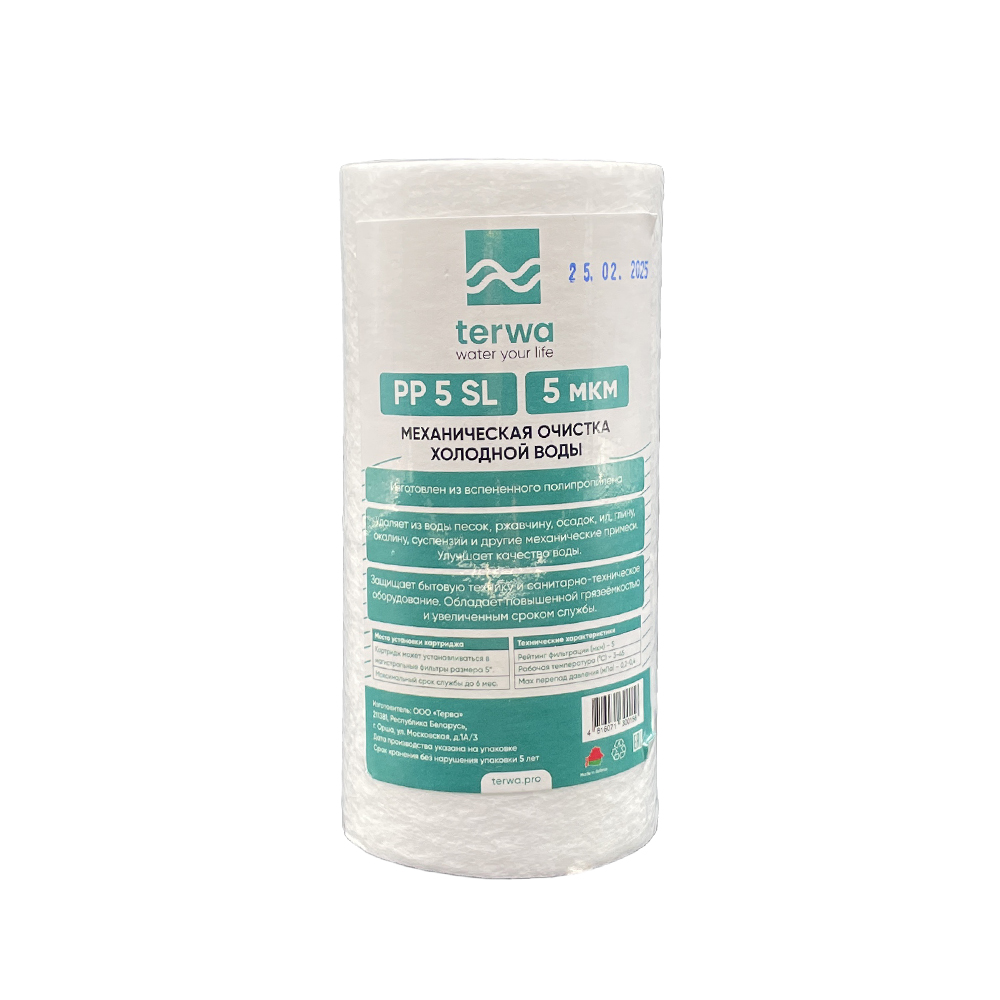 Картридж механической очистки Terwa 5SL 5 мкм предназначен для доочистки воды из централизованных систем водоснабжения от примесей — ржавчины, песка, ила. В качестве фильтрующего вещества используется вспененный полипропилен, который эффективно улавливает частицы размером более 5 мкм.
